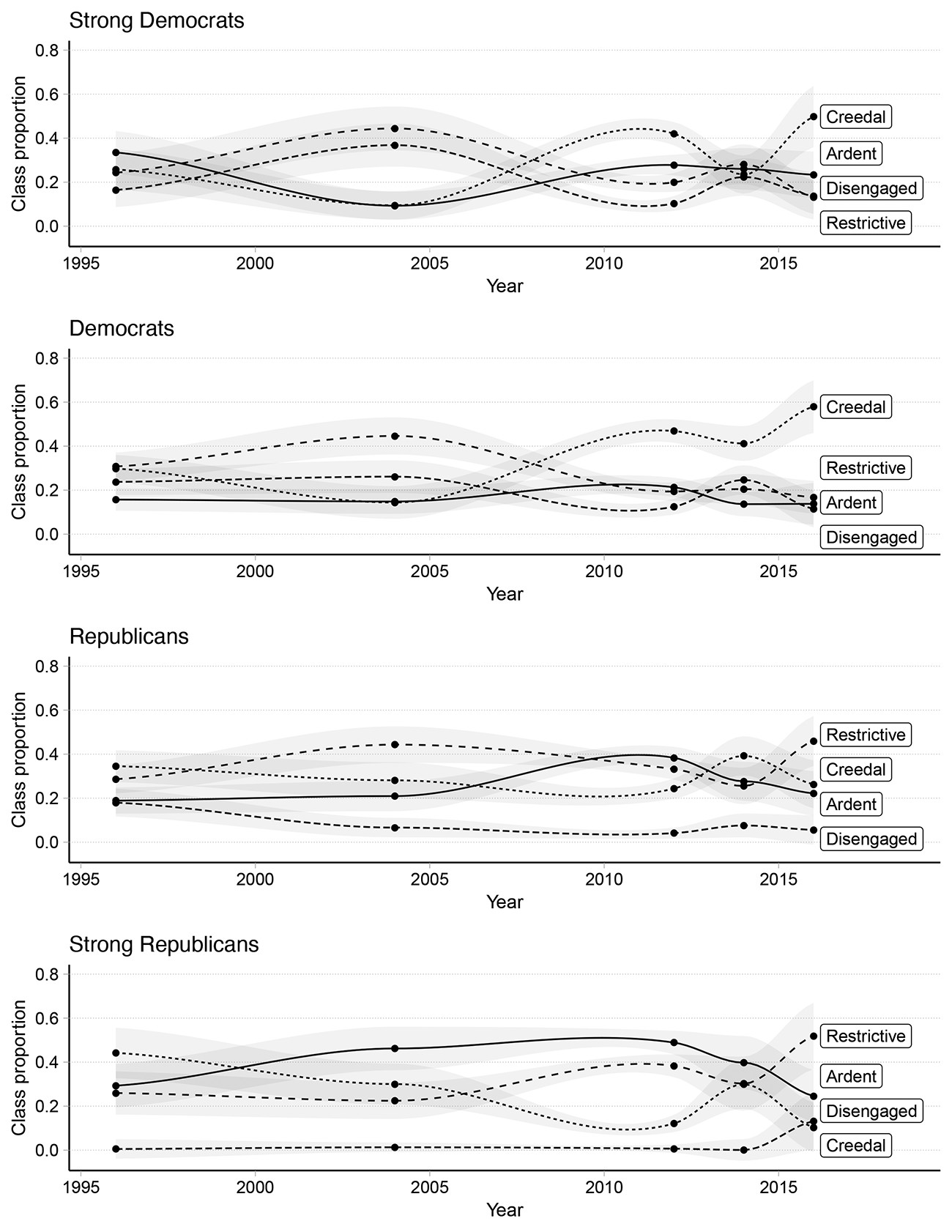 [T]he importance of nationalism in the 2016 election did not result from a sudden surge in the types of nationalism associated with Trump support. On the contrary, popular conceptions of nationhood, on average, were quite stable between 1996 and 2016 (although 2004 and 2012 marked temporary deviations from this trend). This does not imply, however, that public opinion trends were irrelevant for Donald Trump’s success. What our analysis reveals is that over the same time period, Americans’ nationalist beliefs became increasingly mapped onto their partisan identities. By 2016, most Republicans adhered to restrictive or ardent nationalism, while most Democrats espoused creedal nationalist beliefs.
