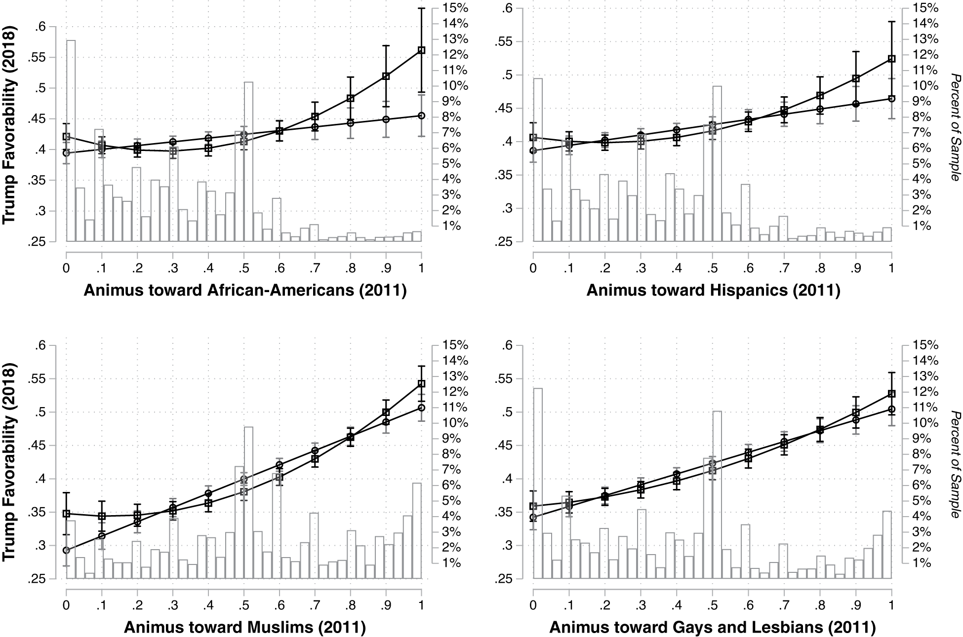 [W]e identified a unique and powerful predictor of (Trump’s) popularity—animus toward Democratic-linked and traditionally marginalized groups. As the Republican Party grows increasingly white, Christian, and male, it may be tempting to explain Trump’s appeal with partisanship alone. However, that is not the case in these panel data. Trump appears to have been uniquely able to attract support based on preexisting animosity toward these groups. The same cannot be said for other Republican Party officials or the Republican Party itself. Similarly, we find no such pattern among Democratic officials or the Democratic Party.
